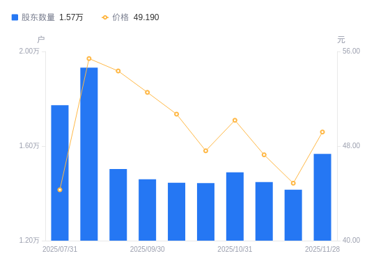 近一年(2024年11月29日至2025年11月28日),智立方A股股东户数从1.12万户,增加至1.57万户,增幅39.69%,区间股价上涨49.12%。