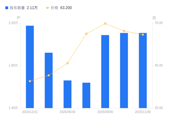近一年(2024年12月31日至2025年11月30日),金诚信A股股东户数从2.18万户,减低至2.11万户,降幅3.12%,区间股价上涨73.15%。