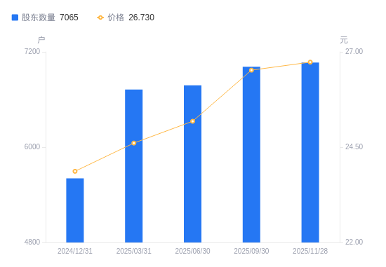 近一年(2024年12月31日至2025年11月28日),赛科希德A股股东户数从5607户,增加至7065户,增幅26.00%,区间股价上涨9.25%。