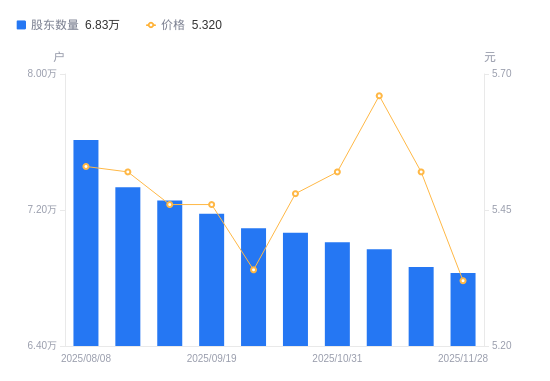 近一年(2024年11月29日至2025年11月28日),珠海港A股股东户数从7.21万户,减低至6.83万户,降幅5.30%,区间股价下跌0.11%。