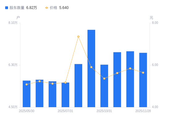 近一年(2024年11月29日至2025年11月28日),云南旅游A股股东户数从5.09万户,增加至6.82万户,增幅33.97%,区间股价上涨0.53%。
