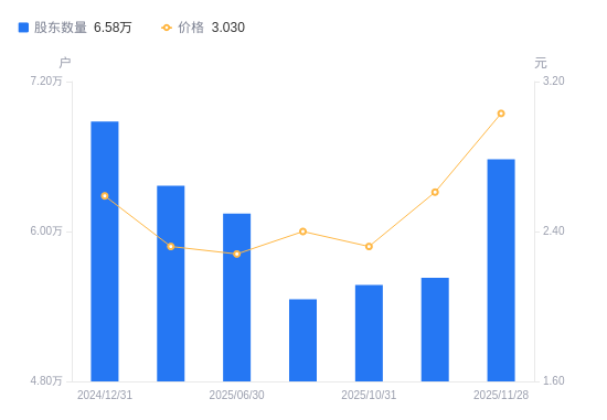 近一年(2024年12月31日至2025年11月28日),世联行A股股东户数从6.88万户,减低至6.58万户,降幅4.40%,区间股价上涨13.06%。