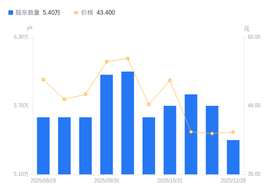 近一年(2024年11月29日至2025年11月28日),鼎捷数智A股股东户数从3.7万户,增加至5.4万户,增幅45.95%,区间股价上涨65.27%。