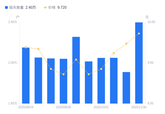 近一年(2024年11月20日至2025年11月20日),浔兴股份A股股东户数从1.4万户,增加至1.91万户,增幅35.92%,区间股价上涨16.91%。