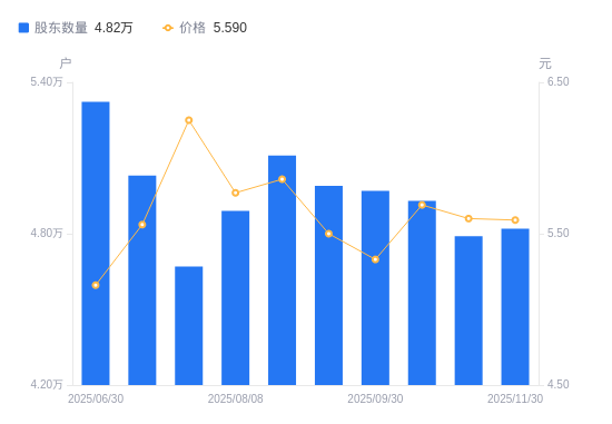 近一年(2024年12月31日至2025年11月30日),东北制药A股股东户数从6.49万户,减低至4.82万户,降幅25.75%,区间股价上涨6.27%。