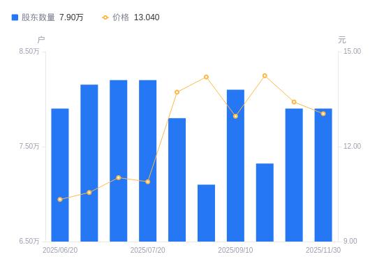 近一年(2024年12月20日至2025年11月30日),潞安环能A股股东户数从6.6万户,增加至7.9万户,增幅19.70%,区间股价下跌9.38%。