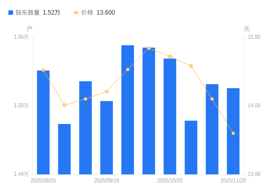 近一年(2024年12月10日至2025年11月28日),友讯达A股股东户数从1.69万户,减低至1.52万户,降幅10.16%,区间股价下跌10.05%。
