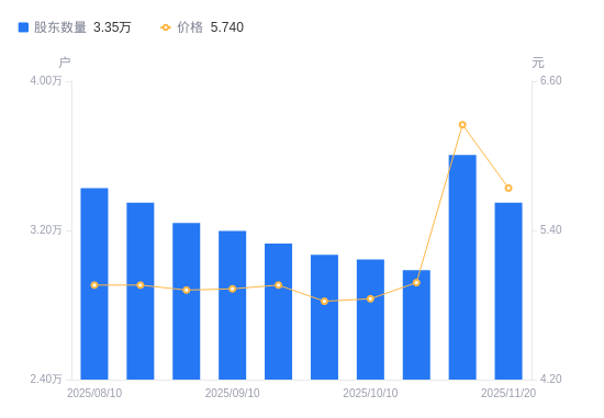 近一年(2024年11月20日至2025年11月20日),*ST中地A股股东户数从5.61万户,减低至3.35万户,降幅40.29%,区间股价下跌44.27%。