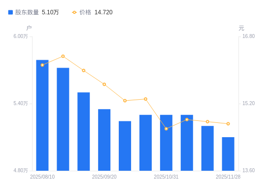 近一年(2024年12月31日至2025年11月28日),葵花药业A股股东户数从4.99万户,增加至5.1万户,增幅2.13%,区间股价下跌28.20%。