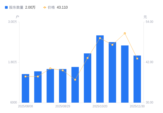 近一年(2024年12月31日至2025年11月30日),雅创电子A股股东户数从1.39万户,增加至2万户,增幅43.90%,区间股价上涨29.39%。