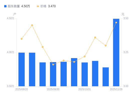 近一年(2024年11月29日至2025年11月28日),红棉股份A股股东户数从3.85万户,增加至4.5万户,增幅16.61%,区间股价上涨7.76%。