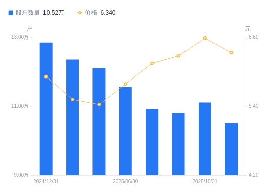 近一年(2024年12月31日至2025年11月28日),华安证券A股股东户数从12.86万户,减低至10.52万户,降幅18.16%,区间股价上涨1.60%。