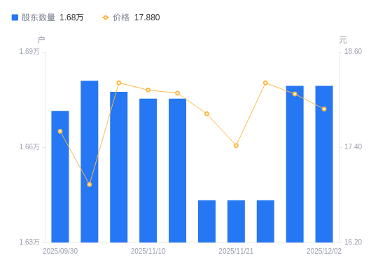 近一年(2024年12月31日至2025年12月2日),川网传媒A股股东户数从1.51万户,增加至1.68万户,增幅11.37%,区间股价上涨22.76%。