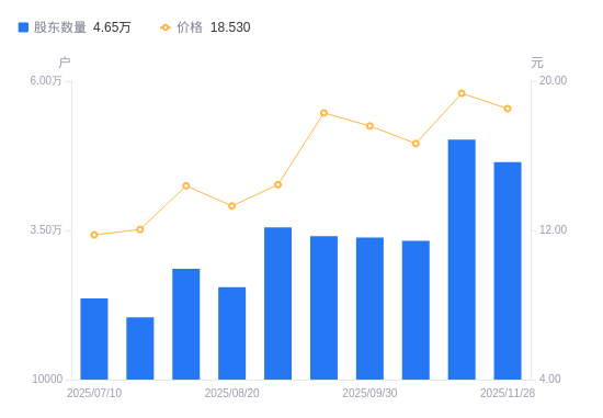近一年(2024年11月29日至2025年11月28日),汇绿生态A股股东户数从2.27万户,增加至4.65万户,增幅104.86%,区间股价上涨131.05%。