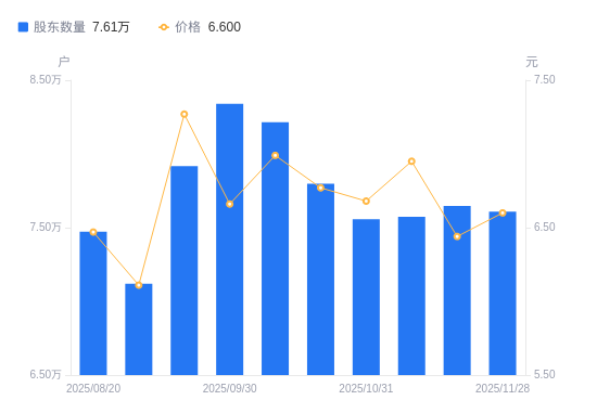 近一年(2024年11月20日至2025年11月10日),宝馨科技A股股东户数从9.9万户,减低至7.57万户,降幅23.47%,区间股价下跌4.79%。