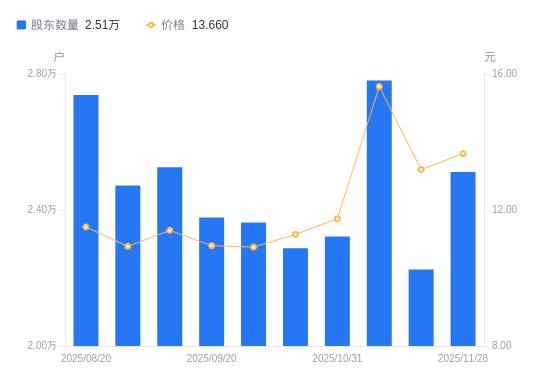 近一年(2024年12月31日至2025年11月20日),安纳达A股股东户数从2.21万户,增加至2.22万户,增幅0.55%,区间股价上涨32.43%。