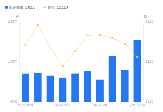 近一年(2024年11月29日至2025年11月28日),美能能源A股股东户数从1.66万户,增加至1.82万户,增幅9.50%,区间股价上涨20.26%。