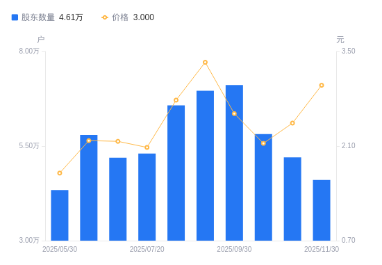 近一年(2024年12月20日至2025年11月30日),ST美晨A股股东户数从4.58万户,增加至4.61万户,增幅0.55%,区间股价上涨15.83%。