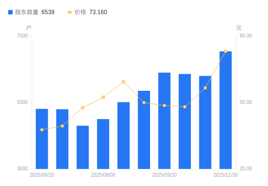 近一年(2024年12月20日至2025年10月31日),*ST松发A股股东户数从8714户,减低至5801户,降幅33.43%,区间股价上涨46.10%。