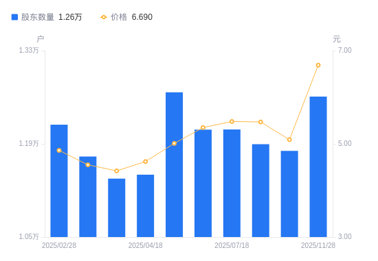 12月5日消息,数据显示,截至2025年11月28日,雪浪环境A股股东总户数为1.26万户,较上期(2025年9月30日)增加817户,增幅6.93%。公司最新A股总股本为3.33亿股,其中流通A股2.91亿股,户均持有流通A股数量为2.3万股,较上期减少1596.62股,降幅6.48%;户均持流通A股市值15.42万元,较上期增加2.88万元,增幅22.92%。