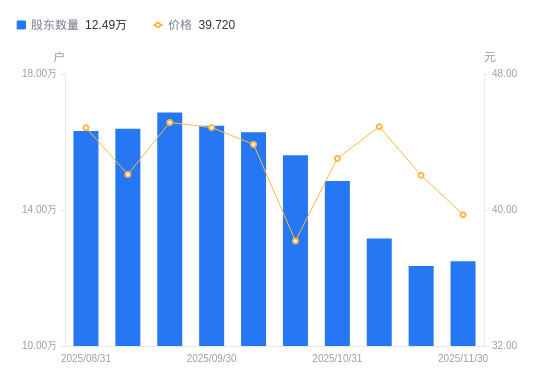 近一年(2024年11月30日至2025年11月30日),神州数码A股股东户数从7.94万户,增加至12.49万户,增幅57.37%,区间股价上涨17.78%。