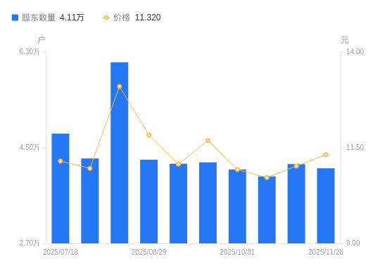 12月5日消息,数据显示,截至2025年11月20日,金现代A股股东总户数为4.19万户,较上期(2025年11月10日)增加2314户,增幅5.84%。公司最新A股总股本为4.52亿股,其中流通A股3.37亿股,户均持有流通A股数量为8040.38股,较上期减少469.72股,降幅5.52%;户均持流通A股市值8.86万元,较上期减少2623.24元,降幅2.88%。