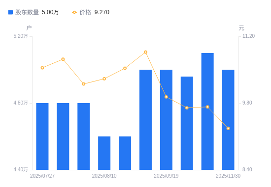 近一年(2024年12月10日至2025年11月30日),仙琚制药A股股东户数从3.2万户,增加至5万户,增幅56.25%,区间股价下跌17.96%。
