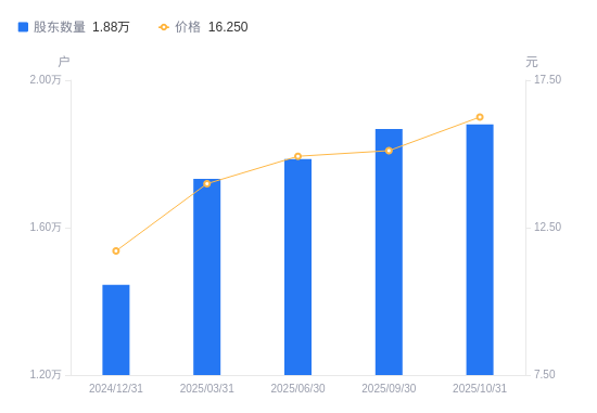 近一年(2024年12月31日至2025年10月31日),恒锋信息A股股东户数从1.45万户,增加至1.88万户,增幅30.12%,区间股价上涨33.20%。