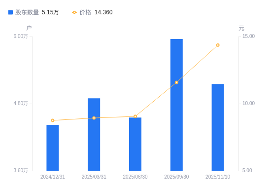 近一年(2024年12月31日至2025年10月31日),鼎胜新材A股股东户数从4.42万户,增加至5.05万户,增幅14.25%,区间股价上涨41.44%。