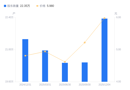 近一年(2024年12月31日至2025年12月4日),方大炭素A股股东户数从21.45万户,增加至22.35万户,增幅4.18%,区间股价上涨20.56%。