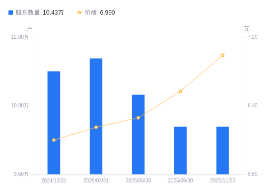 近一年(2024年12月31日至2025年11月20日),延华智能A股股东户数从11.4万户,减低至10.43万户,降幅8.52%,区间股价上涨12.20%。