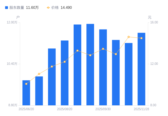 近一年(2024年12月10日至2025年11月28日),西藏珠峰A股股东户数从10.44万户,增加至11.6万户,增幅11.16%,区间股价上涨11.94%。
