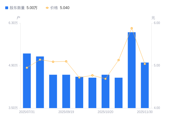 近一年(2024年12月31日至2025年11月30日),浙江众成A股股东户数从3.43万户,增加至5万户,增幅45.79%,区间股价上涨26.47%。