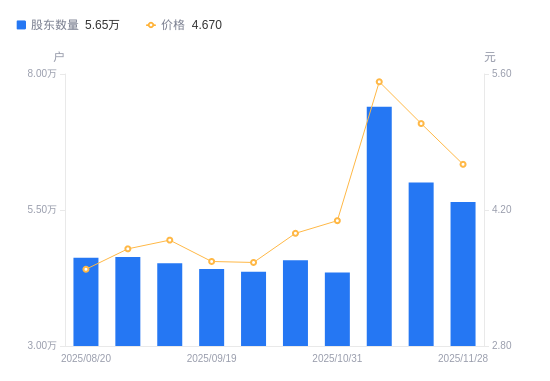近一年(2024年11月29日至2025年11月28日),海新能科A股股东户数从5.75万户,减低至5.65万户,降幅1.73%,区间股价下跌2.71%。