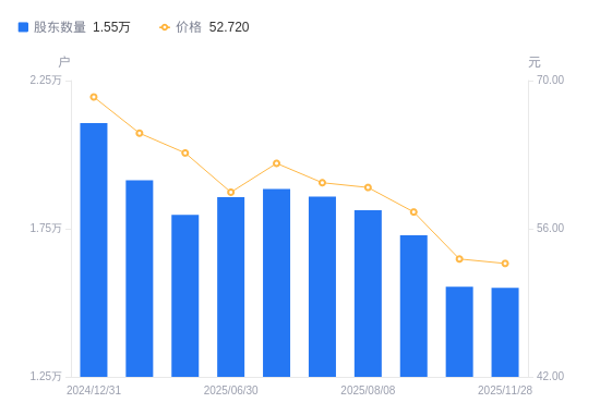 近一年(2024年12月20日至2025年11月10日),亚康股份A股股东户数从2.15万户,减低至1.55万户,降幅27.59%,区间股价下跌34.14%。