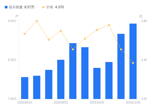 近一年(2024年12月31日至2025年11月30日),宝新能源A股股东户数从9.52万户,减低至8.57万户,降幅9.92%,区间股价下跌0.68%。