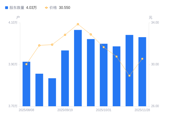 12月10日消息,数据显示,截至2025年11月28日,华阳集团A股股东总户数为4.03万户,较上期(2025年11月20日)减少106户,降幅0.26%。公司最新A股总股本为5.25亿股,其中流通A股5.25亿股,户均持有流通A股数量为1.3万股,较上期增加34.14股,增幅0.26%;户均持流通A股市值39.77万元,较上期增加2.21万元,增幅5.88%。
