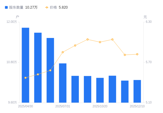 近一年(2024年12月20日至2025年12月10日),中粮科技A股股东户数从11.84万户,减低至10.27万户,降幅13.24%,区间股价上涨0.00%。