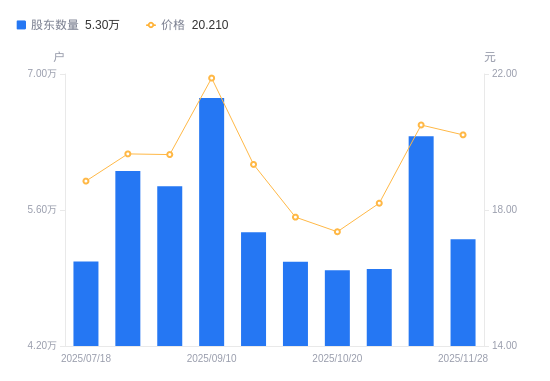 近一年(2024年11月29日至2025年11月28日),元隆雅图A股股东户数从3.64万户,增加至5.3万户,增幅45.65%,区间股价上涨37.95%。