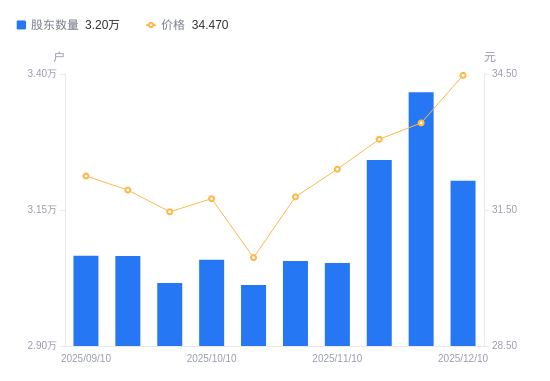近一年(2024年12月20日至2025年12月10日),新余国科A股股东户数从2.47万户,增加至3.2万户,增幅29.64%,区间股价上涨23.46%。