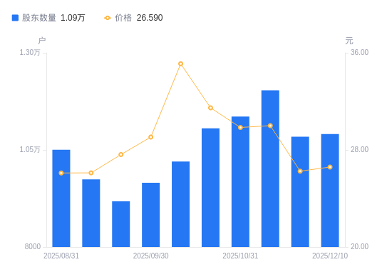 近一年(2024年12月31日至2025年12月10日),金春股份A股股东户数从1.02万户,增加至1.09万户,增幅7.00%,区间股价上涨87.74%。