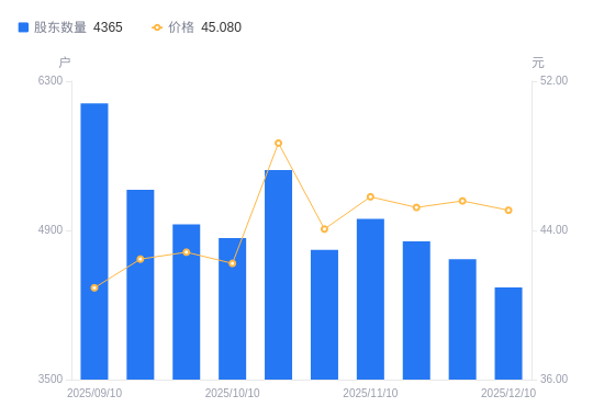 近一年(2024年12月31日至2025年12月10日),鸿铭股份A股股东户数从7383户,减低至4365户,降幅40.88%,区间股价上涨50.77%。