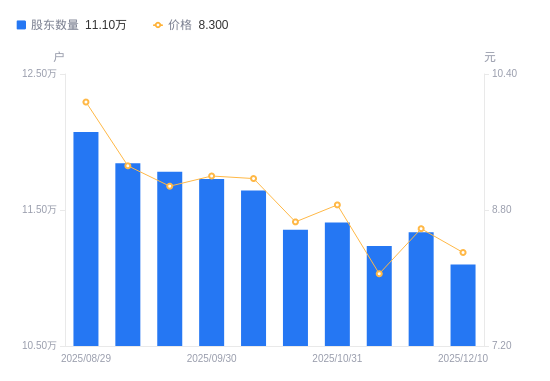 近一年(2024年12月10日至2025年12月10日),卫宁健康A股股东户数从7.69万户,增加至11.1万户,增幅44.36%,区间股价上涨3.30%。