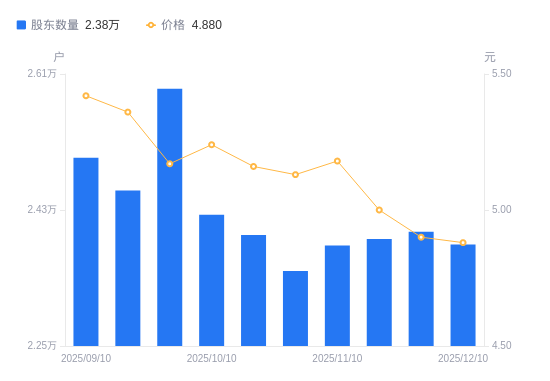 近一年(2024年12月20日至2025年12月10日),永利股份A股股东户数从2.38万户,增加至2.38万户,增幅0.40%,区间股价上涨5.51%。