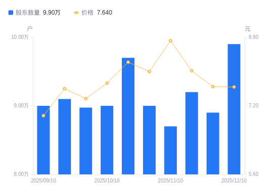 近一年(2024年12月31日至2025年12月10日),华阳股份A股股东户数从10.52万户,减低至9.9万户,降幅5.91%,区间股价上涨10.87%。