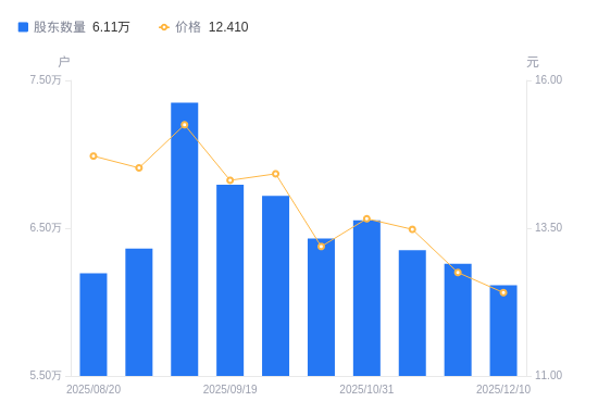 近一年(2024年12月10日至2025年12月10日),圣阳股份A股股东户数从5.09万户,增加至6.11万户,增幅20.06%,区间股价上涨39.28%。