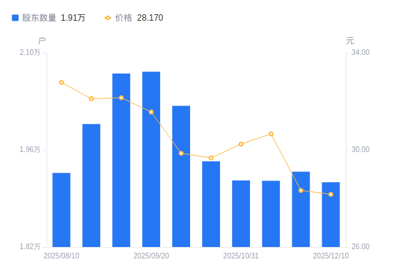 近一年(2024年12月20日至2025年12月10日),神农集团A股股东户数从1.83万户,增加至1.91万户,增幅4.48%,区间股价下跌1.81%。