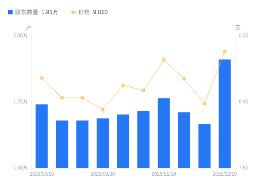 12月11日消息,数据显示,截至2025年12月10日,宿迁联盛A股股东总户数为1.91万户,较上期(2025年11月28日)增加2443户,增幅14.66%。公司最新A股总股本为4.19亿股,其中流通A股1.97亿股,户均持有流通A股数量为1.03万股,较上期减少1508.52股,降幅12.78%;户均持流通A股市值9.27万元,较上期减少6157.66元,降幅6.23%。