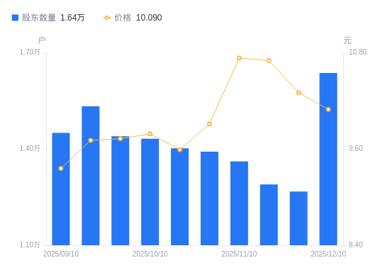 近一年(2024年12月10日至2025年12月10日),恒通股份A股股东户数从1.29万户,增加至1.64万户,增幅27.03%,区间股价上涨6.37%。