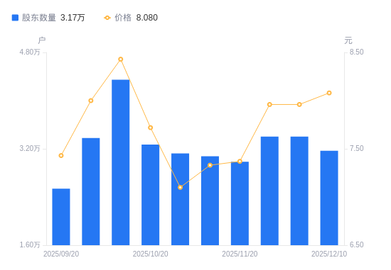 近一年(2024年12月20日至2025年12月10日),鼎信通讯A股股东户数从4.35万户,减低至3.17万户,降幅27.14%,区间股价上涨2.67%。